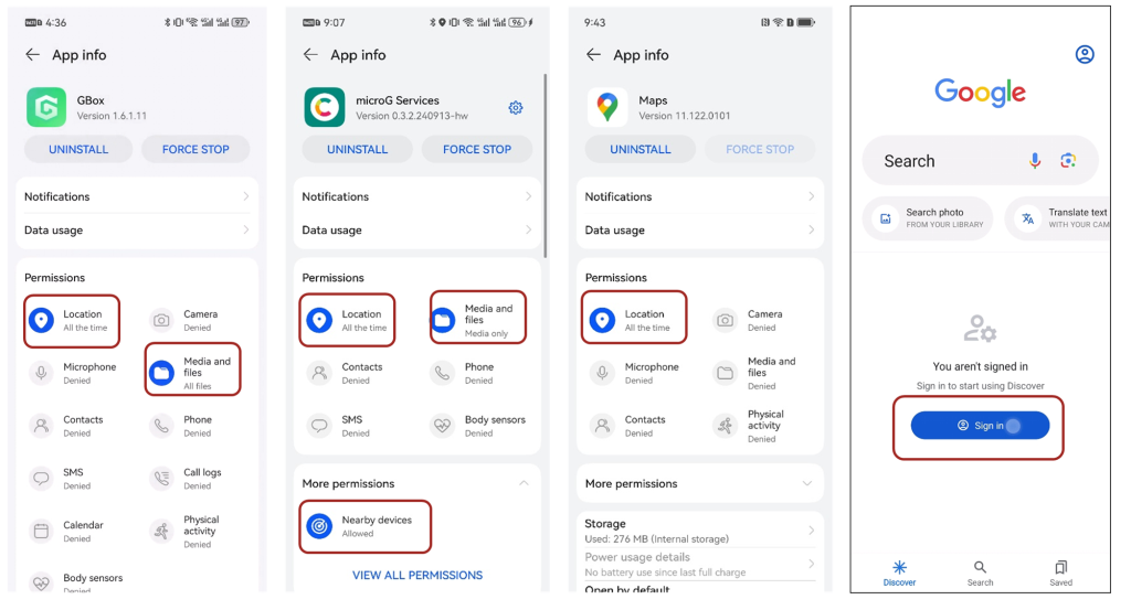 Предоставьте разрешение на определение местоположения Google Maps, MicroG, GBox и войдите в учетную запись Google.